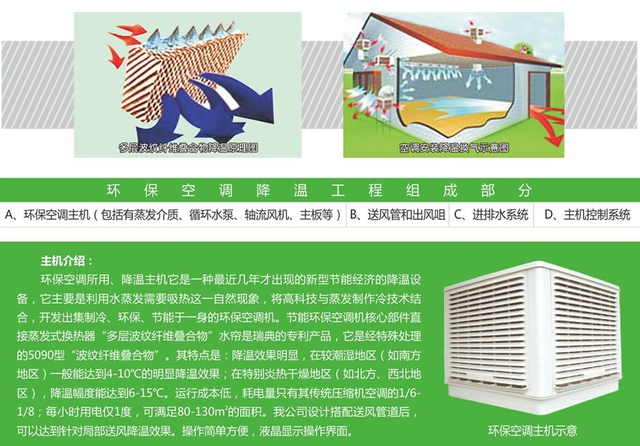 我公司所設計安裝的通風降溫工程主要有環(huán)??照{和水簾降溫 兩種,其降溫原理相同,根據(jù)降溫環(huán)境的具體情況不同,各有優(yōu) 勢。相對其他傳統(tǒng)通風降溫方式(如制冷空調、風扇等)有投資 少、運行費用少、效果好三大優(yōu)勢。環(huán)保空調和水簾通風降溫系統(tǒng) 既經(jīng)濟又環(huán)保的通風降溫方式。