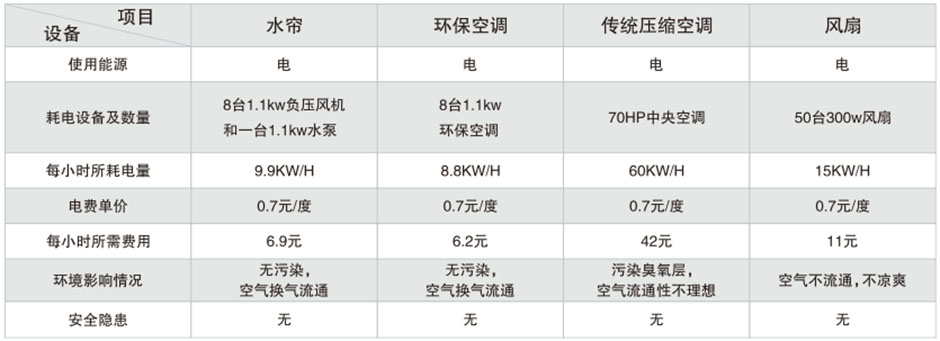 與傳統(tǒng)降溫工程能耗比較環(huán)??照{(diào)和水簾降溫系統(tǒng)的節(jié)能優(yōu)勢(shì)(以1000m2廠(chǎng)房為例)