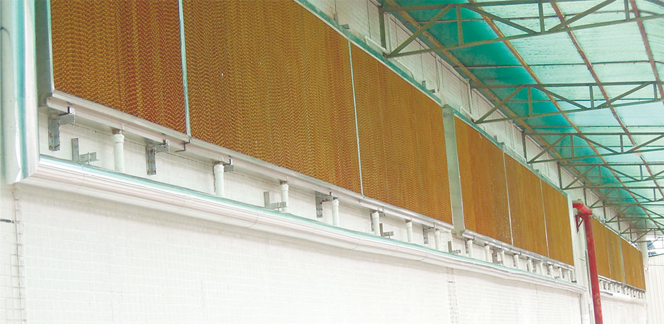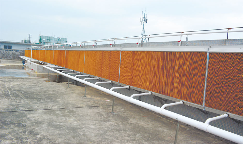 水簾降溫工程由負(fù)壓風(fēng)機(jī)和水簾墻兩大部分構(gòu)成,降溫區(qū)域一面安裝負(fù)壓風(fēng)機(jī),另外一面安裝水簾循環(huán)系統(tǒng)。循環(huán)水泵不間斷地把水箱內(nèi)的水提升,并通過(guò)布水系統(tǒng)均勻地噴淋在蒸發(fā)過(guò)濾層上,(濕簾即多層波紋纖維疊合物),保持濕簾一直濕潤(rùn)。當(dāng)對(duì)面負(fù)壓風(fēng)機(jī)開(kāi)啟時(shí)使室內(nèi)產(chǎn)生負(fù)壓,迫使空氣從水簾一面進(jìn)入,在經(jīng)過(guò)水簾的時(shí)候由于水蒸發(fā)吸熱,空氣的溫度下降,從而使進(jìn)入到室內(nèi)空氣溫度下降,整個(gè)區(qū)域內(nèi)達(dá)到降溫的效果。